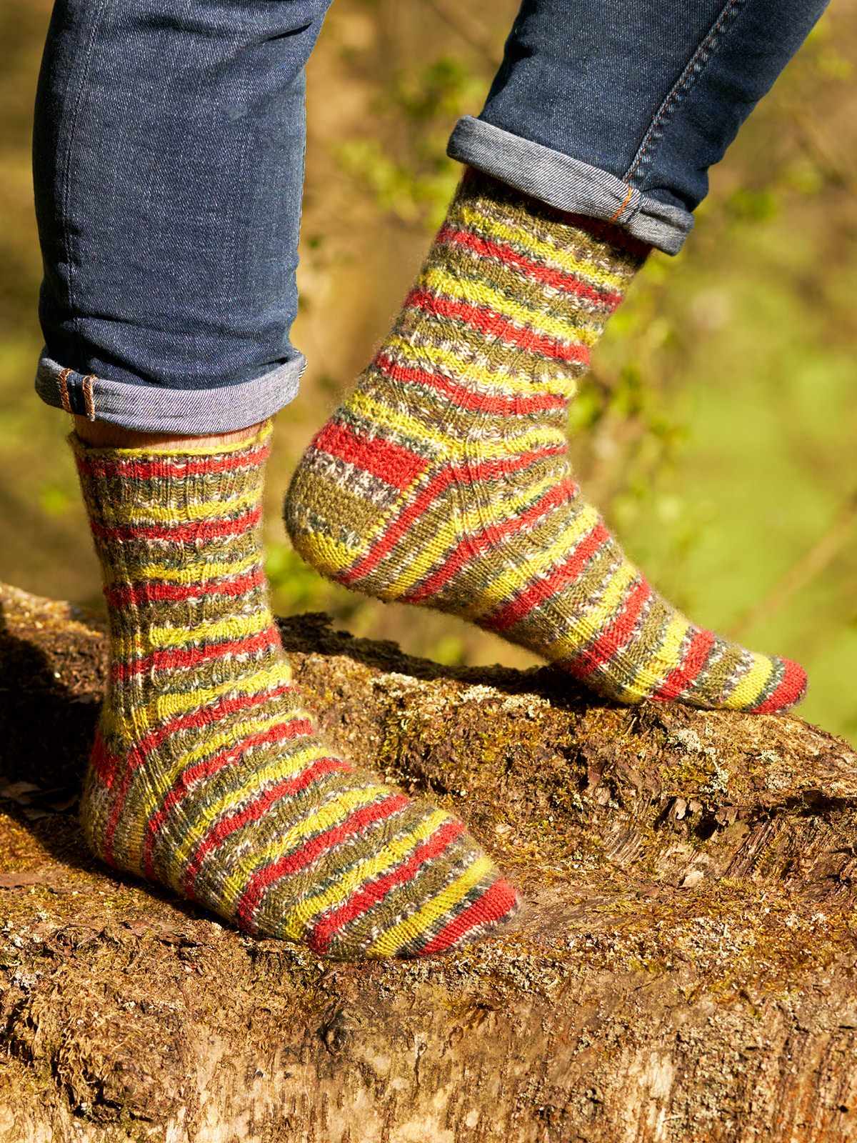 "J'ai toujours aimé observer les oiseaux, qu'il s'agisse des visiteurs habituels des jardins ou des habitants des forêts, des zones humides et des rivages. Il y a tant de variétés, dans un éventail de couleurs magnifiques, chacune avec son propre chant. Mes modèles de chaussettes capturent les caractéristiques enchanteresses de quatre de ces magnifiques oiseaux : Jay, Green Woodpecker, Starling and Swallow". Winwick Mum