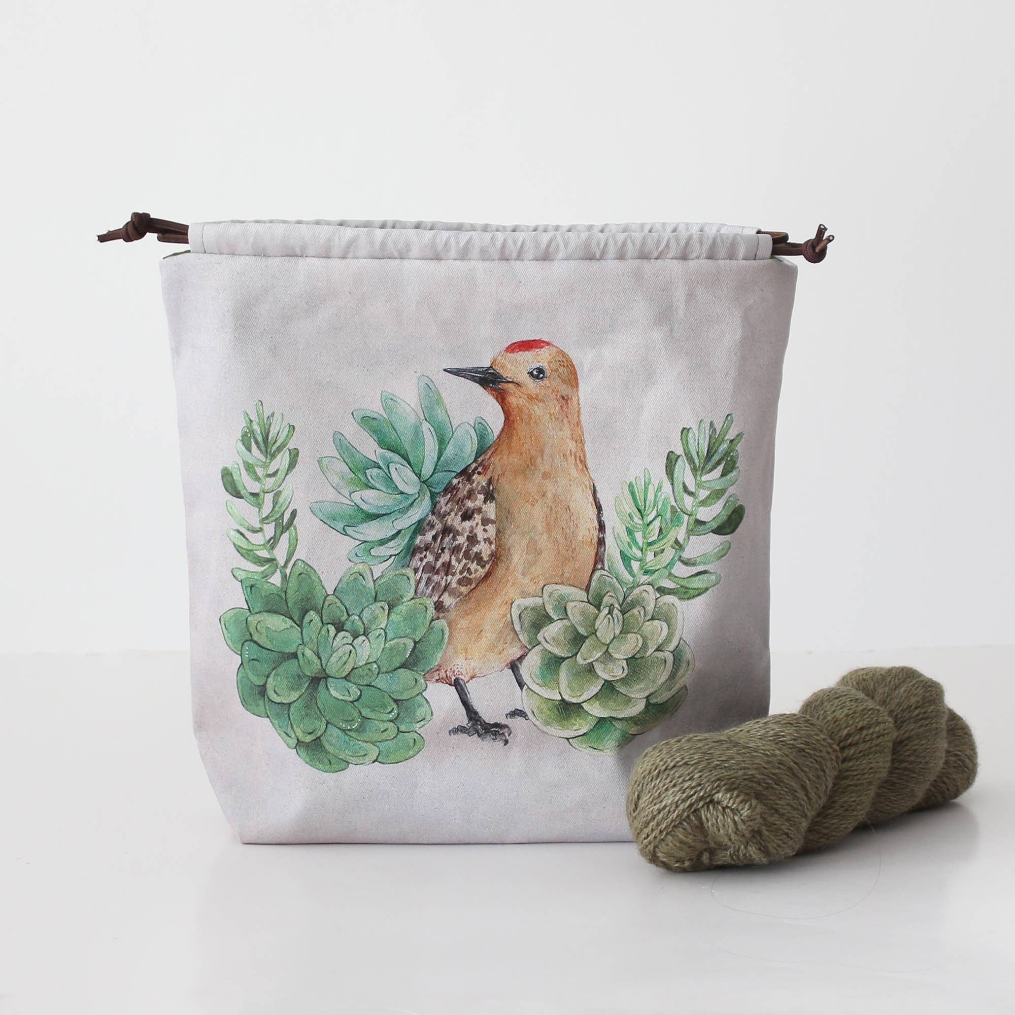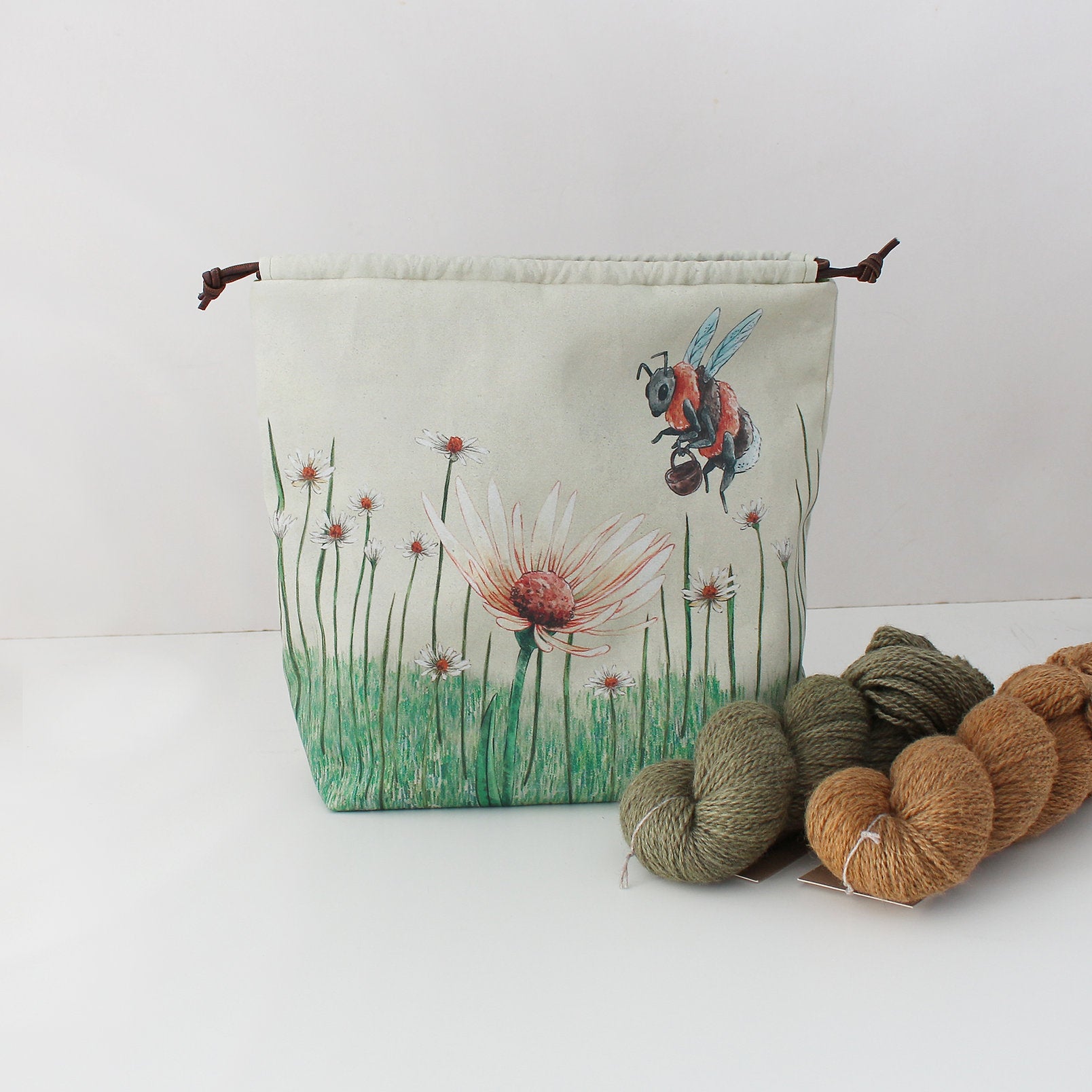 Each handy drawstring project bag is made from a unique print from The Blue Rabbit House. The design is printed on 100% organic cotton.
